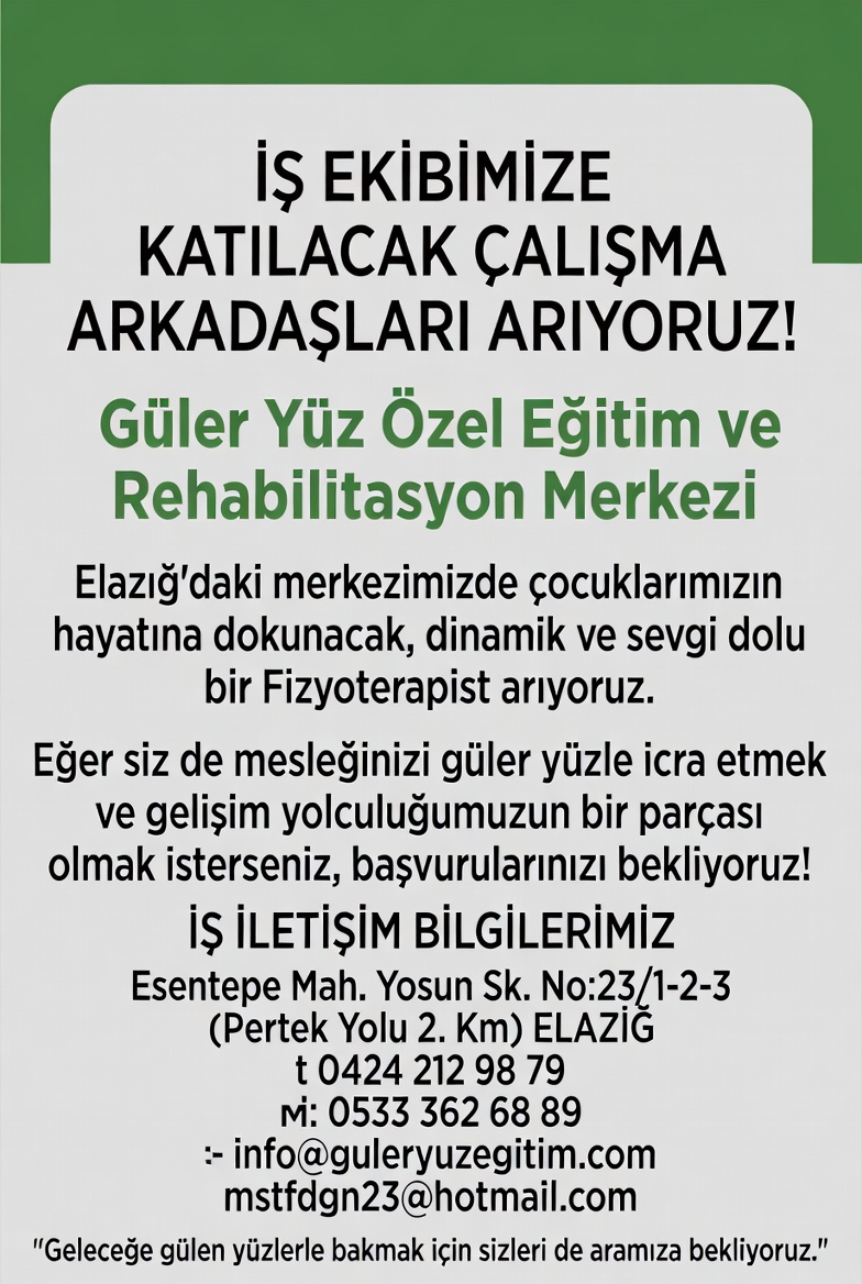 Güler Yüz Özel Eğitim ve Rehabilitasyon Merkezi olarak, Elazığ’daki merkezimizde çocuklarımızın hayatına dokunacak, dinamik ve sevgi dolu bir Fizyoterapist arıyoruz.